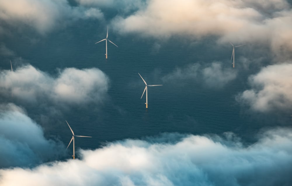 Wind turbines at sea seen with clouds from above